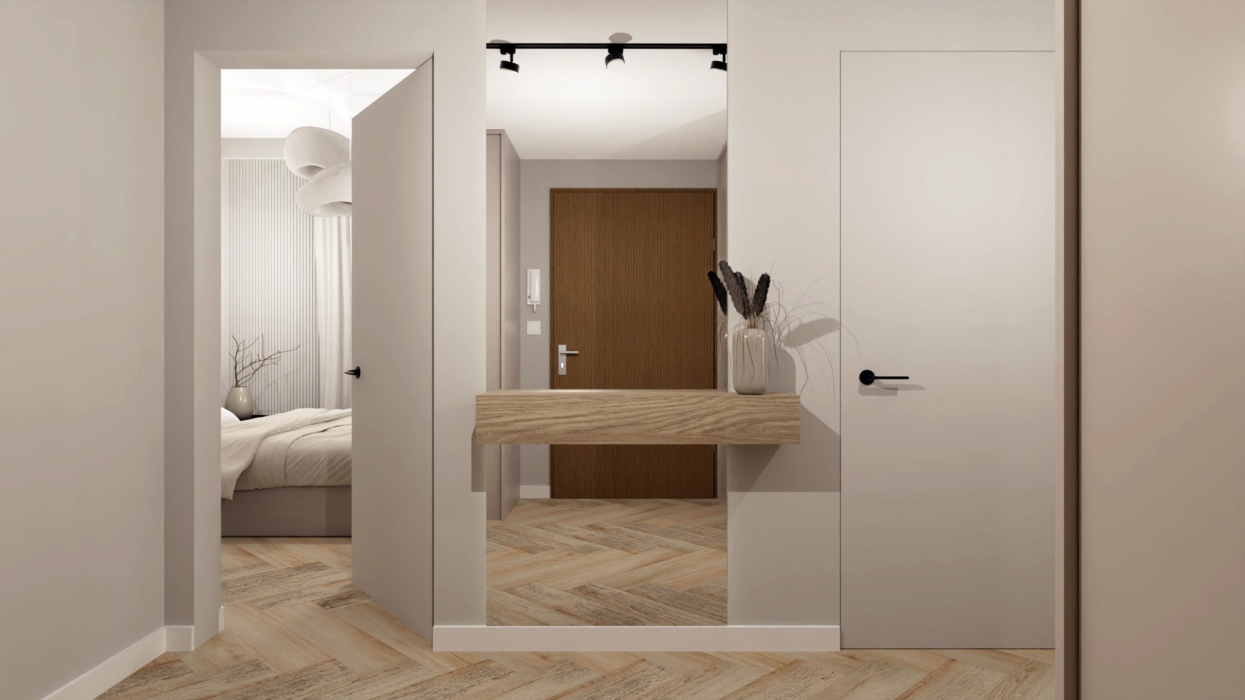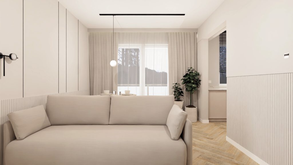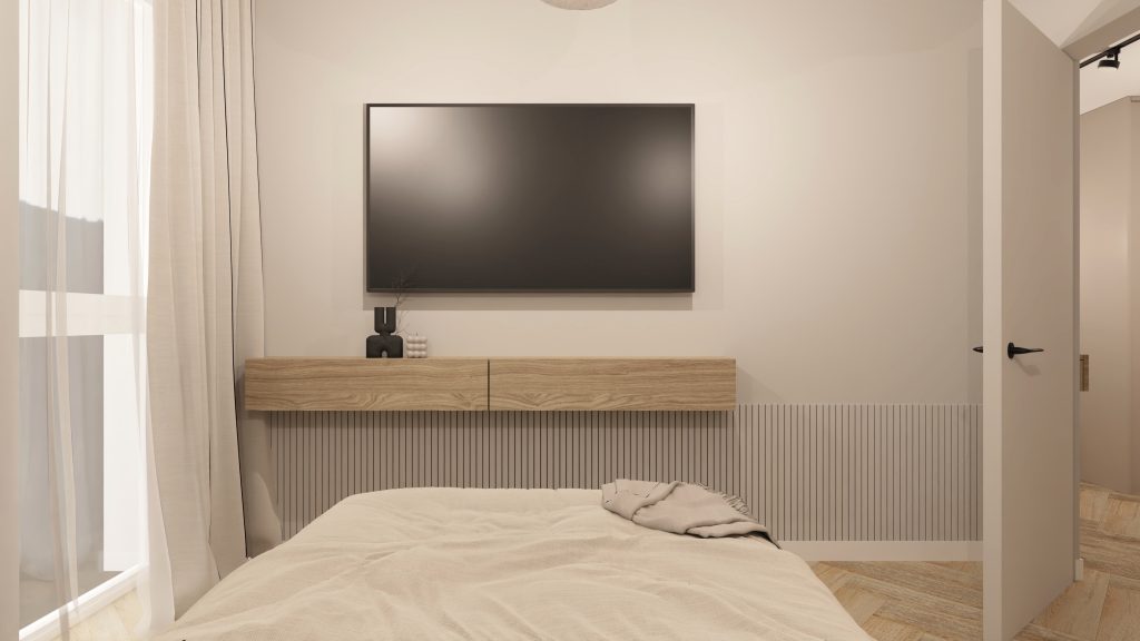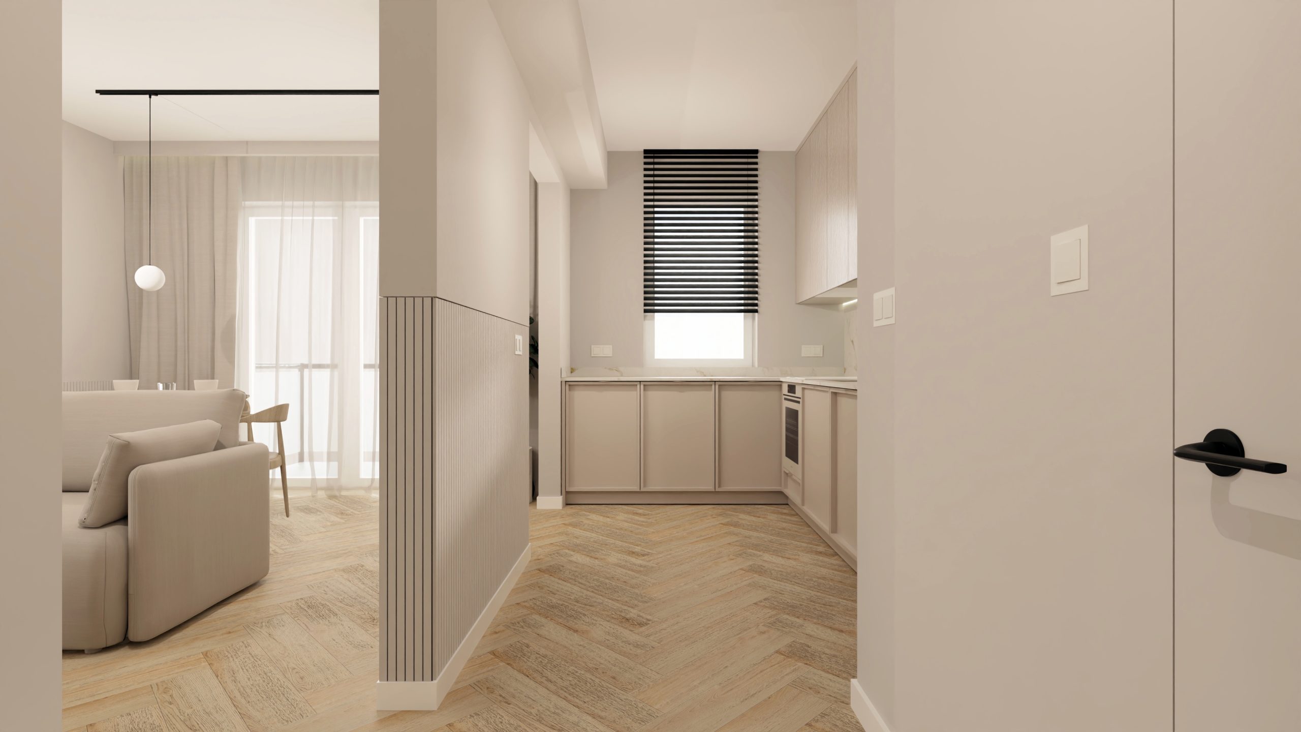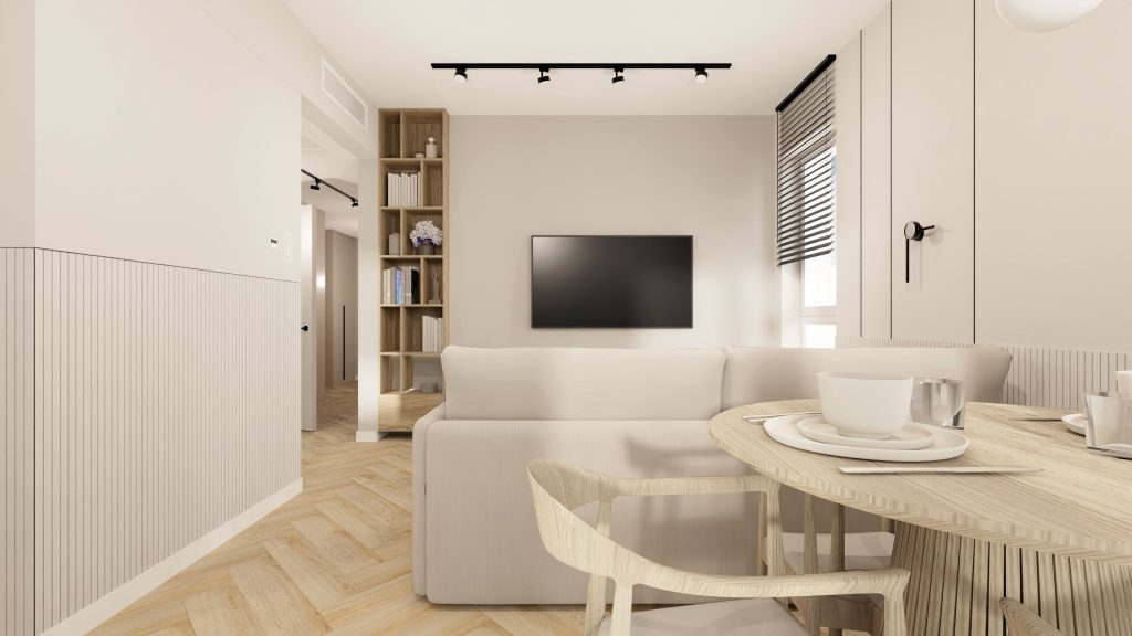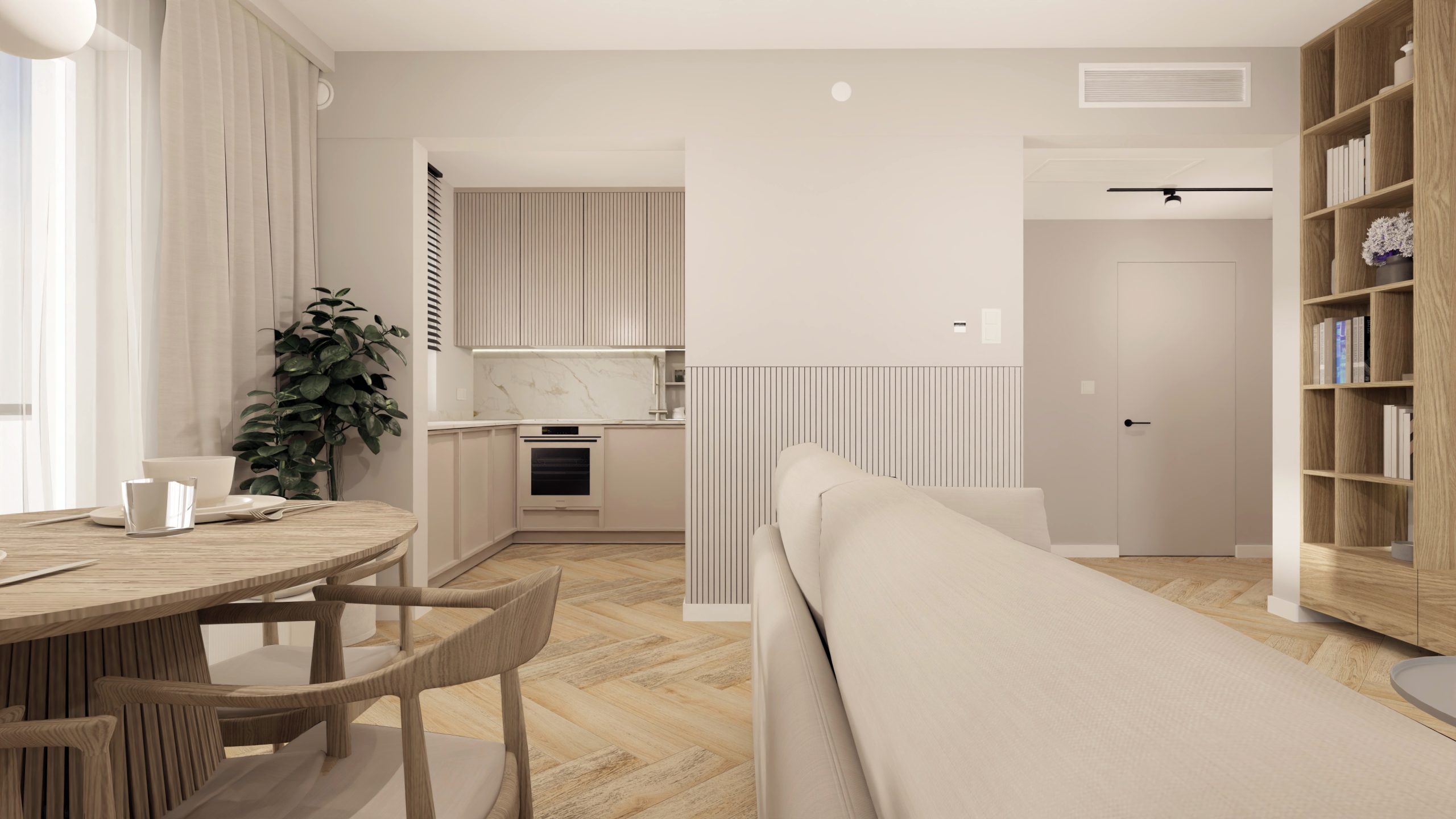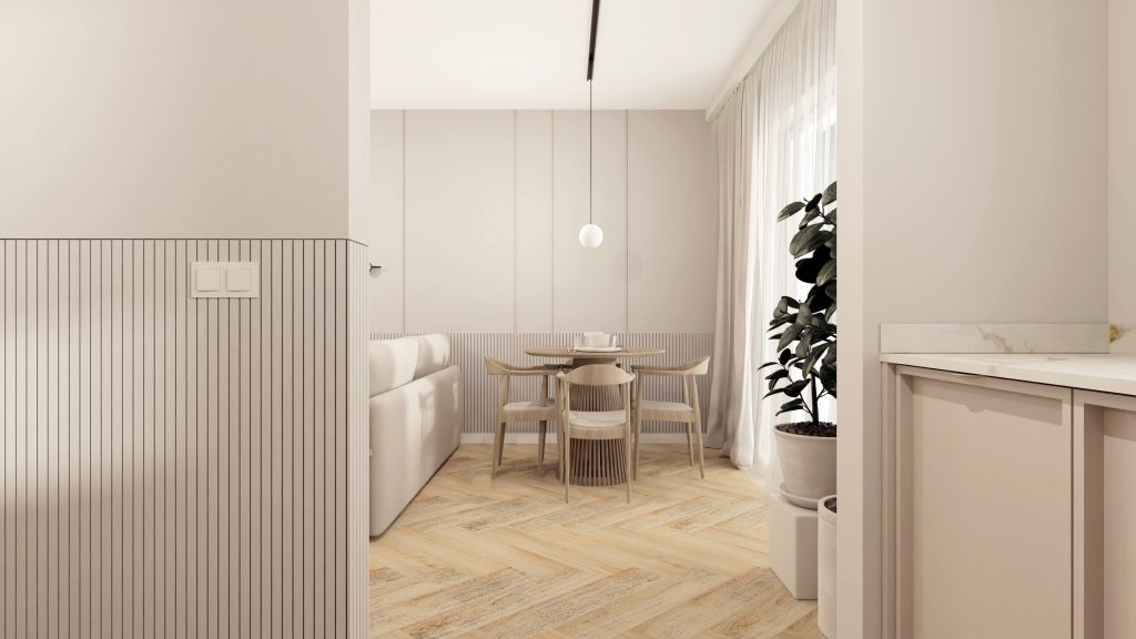 Minimalistyczna aranżacja, w której naturalne światło, jasne drewno i delikatne detale architektoniczne tworzą spokojną, zbalansowaną przestrzeń. Projekt oparty na prostocie, funkcjonalności i ciepłej neutralnej kolorystyce – zaprasza do wnętrza, które daje wytchnienie i sprzyja codzienności.